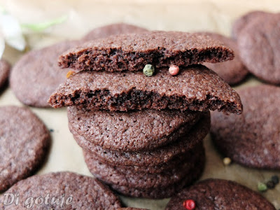 Inspiracja z blogu: Gourmand mama.Nie sądziłam, że słodko-pikantne ciastka będą takie pyszne, więc upiekłam je z pewną dozą obojętności…Efektem było kolejne pieczenie – i to z podwójnej porcji składników!Połączenie kakao i pieprzu to „strzał w dziesiątkę”!Od tego momentu