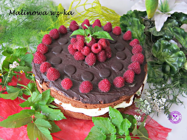 Bardzo czekoladowa wz-ka z soczystymi malinami i słodką bitą śmietanką. Torcik jest obłędny w smaku i do tego pięknie prezentuje się na stole.