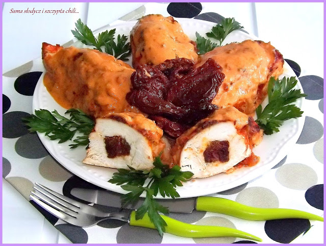 Zapraszam dzisiaj na pyszne mięsko nadziewane suszonymi pomidorami i mozzarellą, pieczone w sosie pomidorowym.Pyszne mięciutki wprost rozpływa się w ustach .