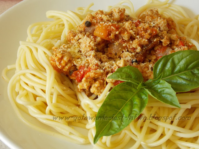Spaghetti z kurczakiem, szpinakiem i pieczarkami