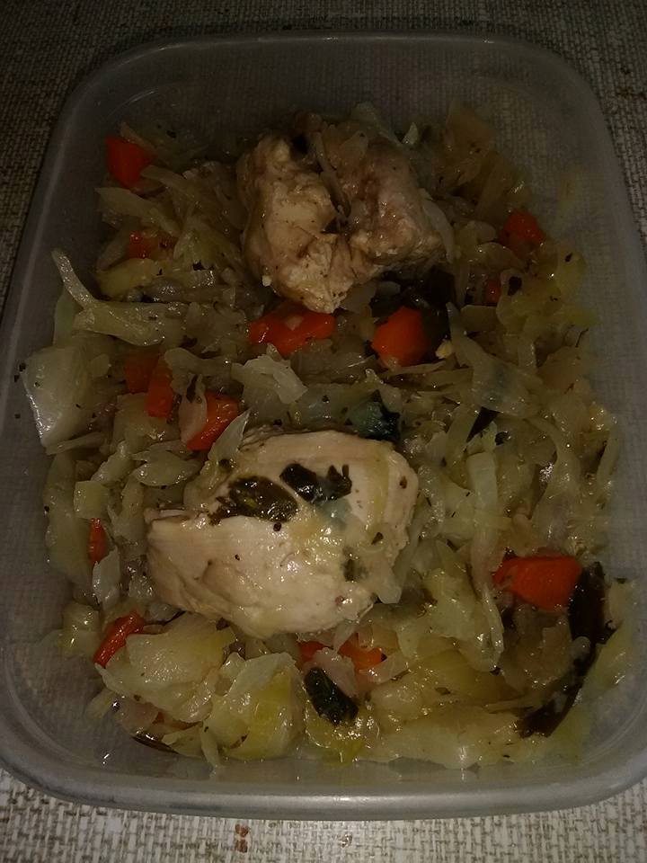 Pyszny dietetyczny lunch do pracy.. Gotowana biała kapusta, marchew, seler naciowy, natka pietruszki,zioła (bazylia, oregano) i gotowana pierś z kurczaka,.