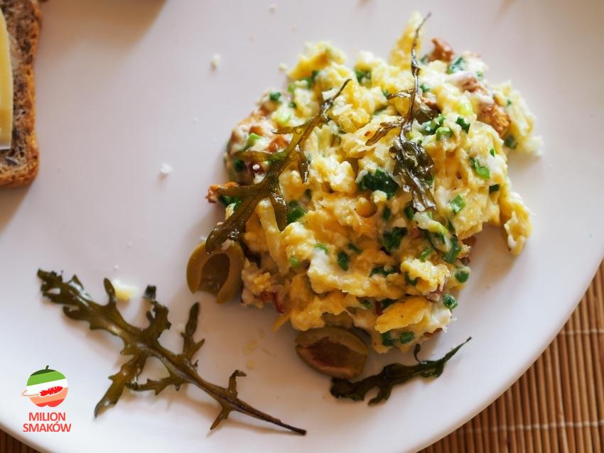 Klasyczna polska jajecznica z kurkami i cebulką wzbogacona o dość nietypowe dodatki: oliwki, które dają ciekawą przeciwwagę smaku i chipsy z rukoli.