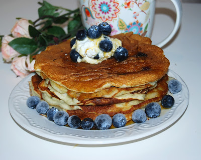 Placki z borówkami, podane ze śmietaną, a całość polana syropem klonowym. „Niebo w gębie”