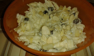Kalarepa – 2 sztRodzynki – 6 łyżekPłatki migdałowe – 5 łyżekMajonezu – 5 łyżekSok z cytrynyCukierSól