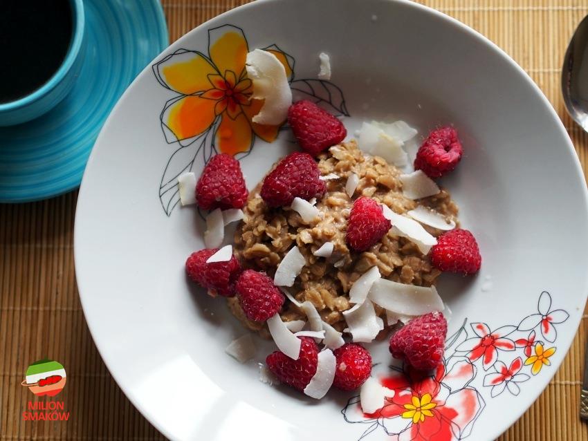 Karobowo-orzechowa owsianka z malinami i płatkami kokosa