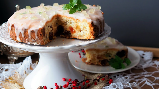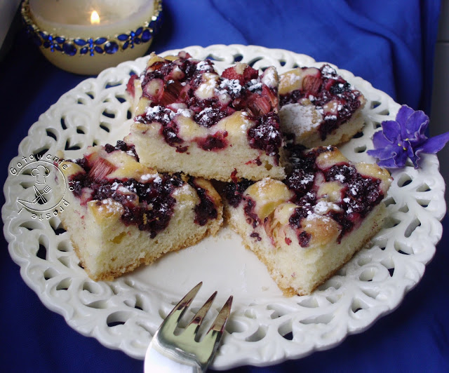 Musiałam uruchomić piekarnik, ale nie u siebie, a u mamy i na ekspresa powstało to ciacho. Wilgotne, w smaku przypominające ucierane, z jeżynami z nalewki oraz z małą gałązką rabarbaru 😉