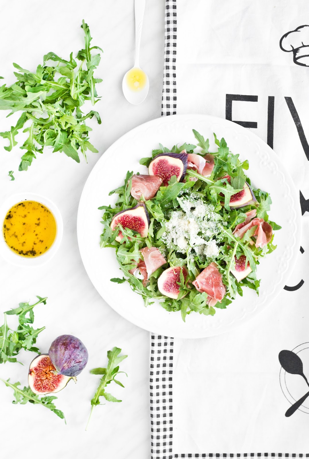 Kiedy świeże figi pojawiają się w sklepach mogę jeść je na okrągło. Uwielbiam ich uniwersalność – świetnie smakują zarówno na słodko, jak i na wytrawnie. Dzisiaj mam na dla Was bardzo pyszną i prostą sałatkę z rukolą, figami i szynką parmeńską.