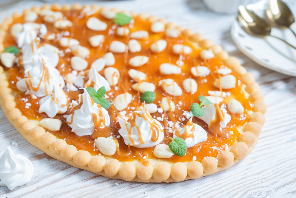 Mazurek wielkanocny na kruchym cieście z pyszną konfiturą morelową, bezikami i solonym…