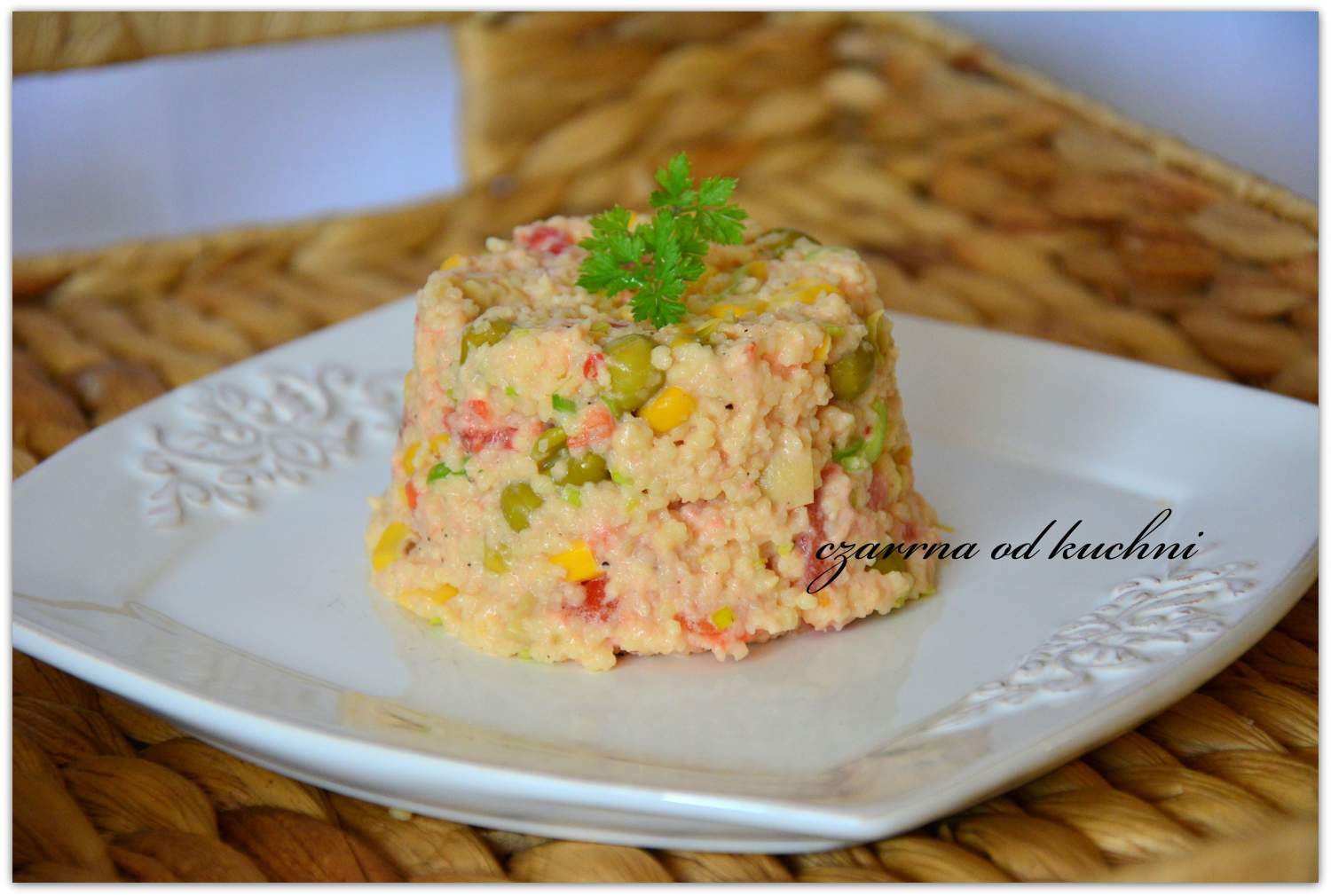 Składniki: 1 puszka mieszkanki groszek z kukurydzą Jamar 120 g kaszy kuskus 3 duże pomidory kawałek pora 1 słoik marynowanych pieczarek jarzynka 2 łyżki majonezu pieprz Przygotowanie: Kuskus posypać jarzynką i …