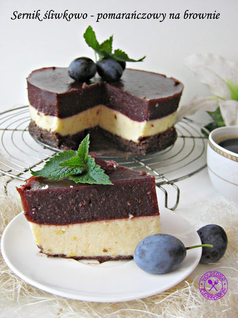 Obłędnie czekoladowe brownie, pomarańczowy sernik i słodko kwaśny mus śliwkowy z pomarańczą. A to wszystko w jednym kawałku ciasta!