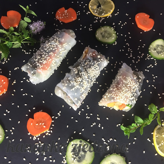 Od dwóch tygodni chodził za mną mąż i marudził, że chce spring rolls. W końcu dałam się namówić. Nie miałam czasu wyskoczyć do sklepu, więc obył się bez sosu mango. Z to zrobiłam sos z czarnego sezamu. Łyżkę nasion utarłam w moździerzu z garścią listków świeżej mięty i sokiem z