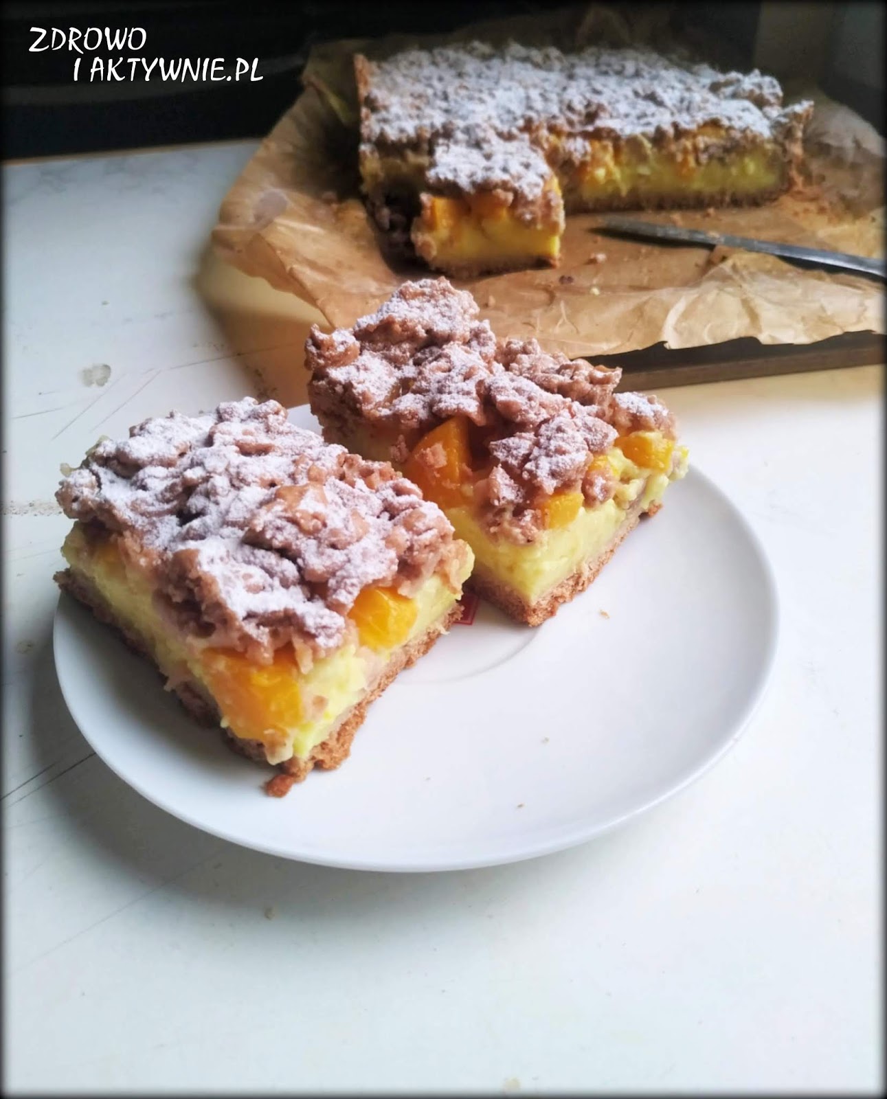 Kruche ciasto z budyniem waniliowym i soczystą brzoskwinią. Przepis na dużą blachę.…