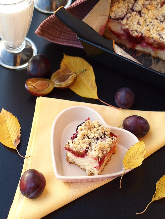 Puchate, lekko słodkie ciasto drożdżowe z kwaśnymi śliwkami i chrupiącą kruszonką. Jak to drożdżowe – najlepsze pierwszego dnia, dla mnie obowiązkowo jeszcze ciepłe (a zdjęcia robiłam, gdy ciasto było jeszcze gorące, więc naprawdę dobrze się kroi), choć to podobno niezdrowe 😉