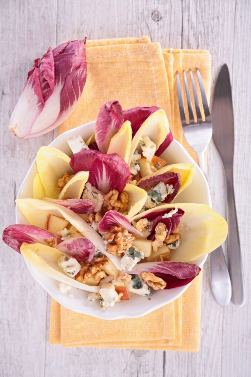 SAŁATKA Z CYKORIĄ, JABŁKIEM, NIEBIESKIM SEREM I ORZECHAMI idealnie pasuje…