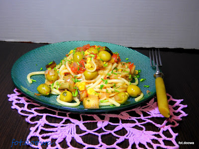 Piersi pokroić w paseczki i obsmażyć na oleju z przyprawami (można użyć ugotowanej), składniki pokroić. Wymieszać, można dodać żółtą paprykę.