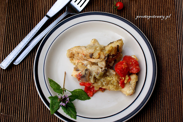 około 70 dag świeżego szczupaka ( może być filet)duży pomidorok. 50 dag pieczarekgęsty jogurt naturalny ok. 3/4 szklankiśmietana 18 % ok. 1/2 szklankicebulajajkoolej do smażeniamąka, sól, pieprz cytrynowy, ok. 3-4 łyżek tartego żółtego sera