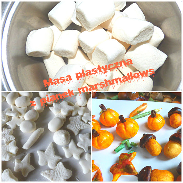 Znacie pewnie moje okolicznościowe torty, które najczęściej zdobię masą cukrową. Jednak oprócz masy cukrowej robię też masę z pianek marshmallows. Ta masa jest prawie tak plastyczna jak plastelina i nadaje się doskonale do robienia najróżniejszych ozdób. Tym razem będą to jesienne kompozycje, które zostaną