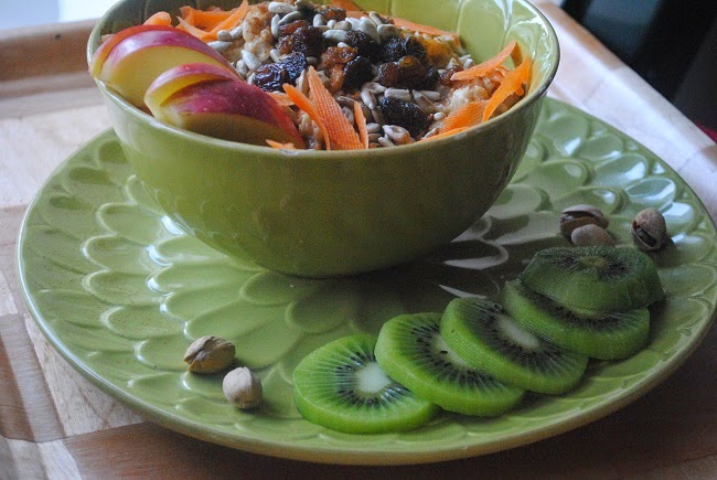 571. Jabłkowo- marhcewkowa owsianka z cynamonem, słonecznikiem, rodzynkami i miodem