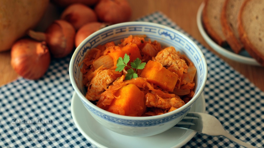 Szybki bigos z kiszonej kapusty z indykiem i dynią. Dodanie dyni miało być eksperymentem a jak się okazało było całkiem dobrym pomysłem, bo danie wyszło naprawdę bardzo smaczne. Można podawać je z pieczywem lub tłuczonymi ziemniakami i właśnie w tej drugiej wersji smakuje nam najbardziej. Mam jeszcze w zanadrzu kilka