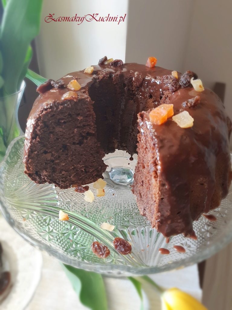 Murzynek z bakaliami lub gotową mieszanką keksową, puszysty, delikatny, z polewą czekoladową,…