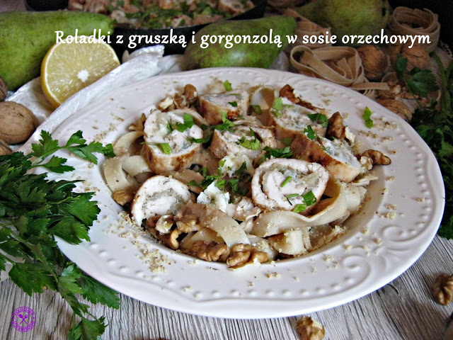 Nie od dziś wiadomo, że gruszki idealnie pasują do sera gorgonzola i orzechów. Najczęściej orzechy są farszem roladki. Ja troszkę pokombinowałam i stworzyłam sos orzechowy gdzie orzechy maja formę pudru. Sos ma piękny karmelowy kolor. Mięso ma delikatny posmak słodkości dzięki gruszce, ale przewagę ma wyrazisty ser gorgonzola.
