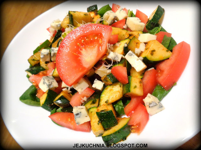 Składniki:2-3 większe garści świeżego szpinaku,2 średnie cukinie, duży pomidor,2/3 opakowania sera