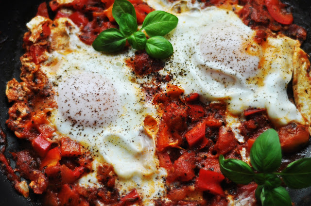 Szakszuka to potrawa, która jest niezwykle popularna w Turcji oraz Izraelu. Banalnie prosta – niezwykle smaczna. Tradycyjna wersja, czyli ta, którą podaje niżej składa się jedynie z cebuli, jajek, pomidorów, papryki i przypraw. Najlepiej smakuje prosto z patelni w towarzystwie świeżej bazylii i chrupiącej bagietki lub chleba.