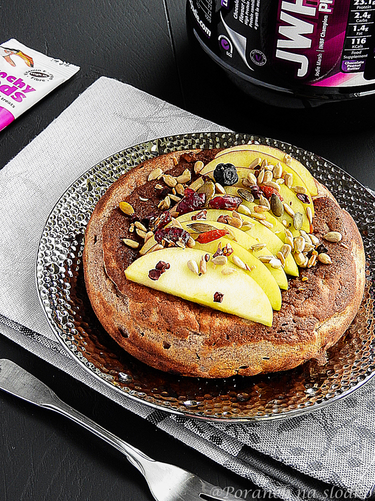 Omlet z jabłkiem to danie, które kojarzy mi się właśnie z jesienią.Smaku nadała mu odżywka białkowa, mąka bananowa oraz miks prażonych ziaren i owoców.Całość z dodatkiem cynamonu smakowała jak typowe, jesienne ciasto z jabłkami.