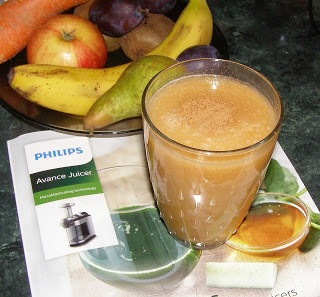 marchew 2 sztuki średnie, gruszki 3 sztuki, banan 1 sztuka, jabłka 3 sztuki, limonka 2 plastry, kiwi 2 sztuki, woda filtrowana lub mineralna 1,5 szklanki, olej rzepakowy 1 łyżeczka, cynamon 1 łyżeczka