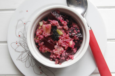 Kasza jaglana ma delikatny smak i świetnie komponuje się ze słodkimi buraczkami, delikatnym filetem z indyka oraz jarmużem. Dla równowagi kolorów dodałam fioletowy jarmuż. To danie sprawdzi się jako obiad oraz lunch do pracy. Nawet na zimno smakuje. Dodatkowo jego smak wzbogaciłam o kwaśne jabłko i selera naciowego.