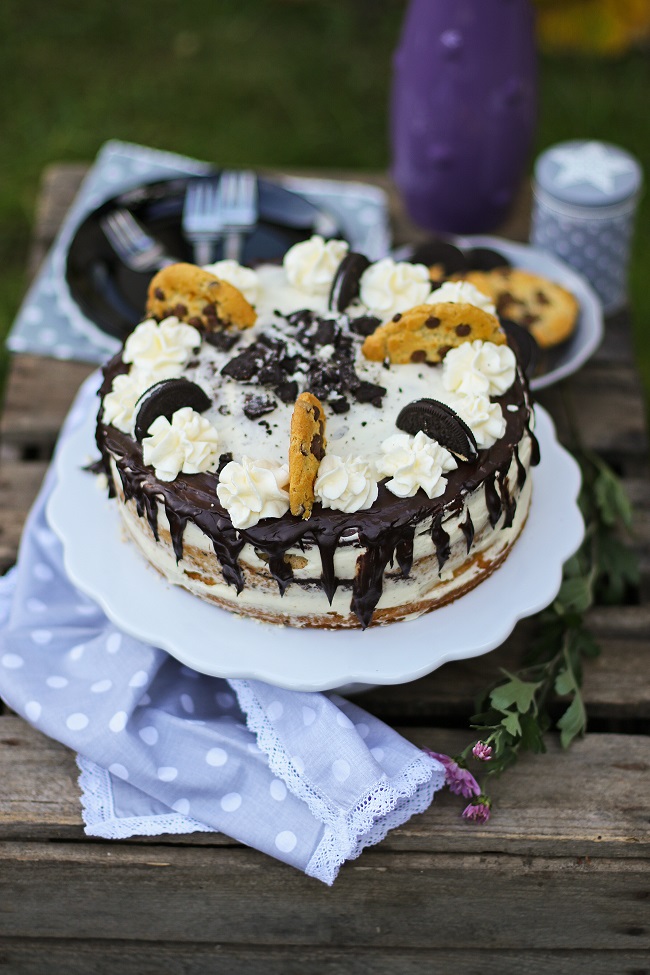 Rzuciło mi się w oczy zdjęcie takiego tortu w internecie i nie mogłam się powstrzymać, żeby nie spróbować go odtworzyć na swój sposób. No więc co my tu mamy? Hm… Trzy rewelacyjne ciasta w jednym: brownie, chocolate chip cake