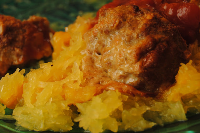 „Spaghetti” z dyni makaronowej z klopsami ze słonecznikiem i płatkami owsianymi
