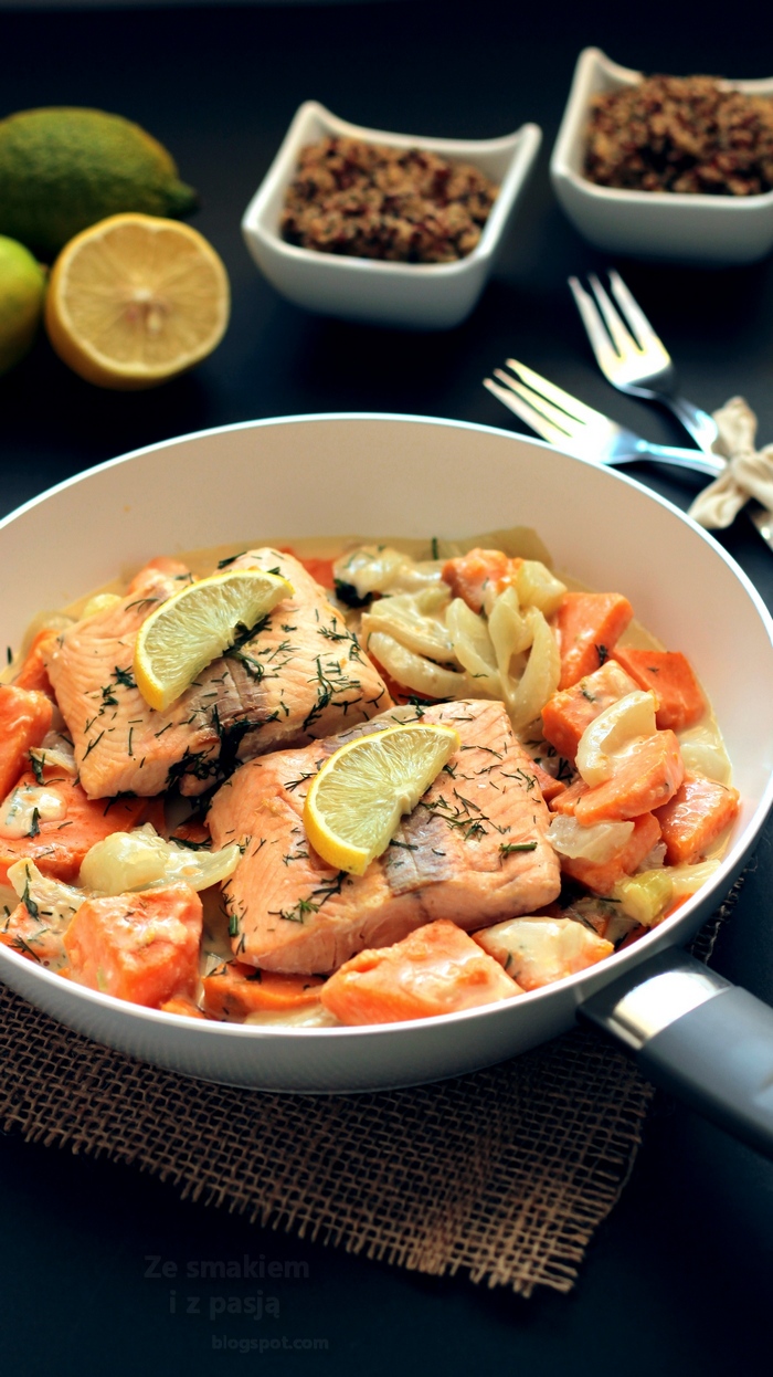 Bardzo często na naszym stole gości ostatnio dziki łosoś. Jeżeli jeszcze go nie próbowaliście to zachęcam do przygotowania jakiejś potrawy z takim łososiem w roli głównej. Można podawać go na wiele sposobów: piec, smażyć, gotować na parze w towarzystwie kolorowych warzyw, aromatycznych sosów itp. Jest smaczny i znacznie zdrowszy od