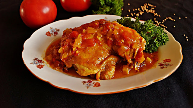 2 udka z kurczaka2 cebule2 ząbki czosnku2 pomidory1 szkl wody1/2 łyżeczki kolendry1 łyżeczka kurkumy1 łyżeczka curry1 łyżeczka