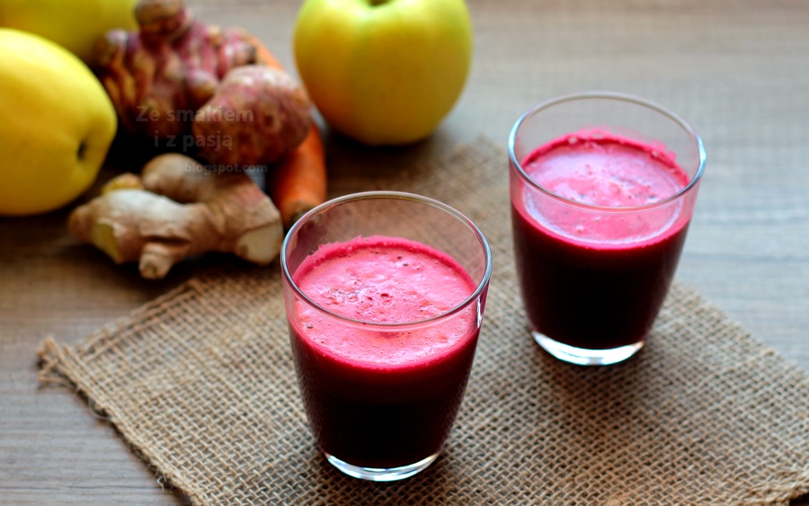 Pełen witamin sok z buraka, topinamburu, jabłka, marchewki i odrobiny imbiru. Już żałuję, że resztę buraków ugotowałam na ćwikłę 😉 Nie sądziłam, że wyjdzie taki dobry i, że moja poczciwa sokowirówka poradzi sobie z twardymi burakami 🙂 Buraczki i topinambur wspomagają trawienie, warto popijać taki sok jeśli ma się z