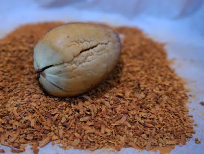 Pestkę po awokado zostawić w ciepłym miejscu do podsuszenia na 24h. Świeżo wyłuskana pestka jest śliska i bardzo nieporęcznie się ją obiera. Po podsuszeniu pestki usunąć wierzchnią łupinkę i zetrzeć na tarce o drobnym oczku.