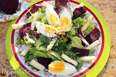 Przepis autorski (mój).Sałatka jest pyszna, zdrowa i niezwykle szybka w przygotowaniu (o ile posiadamy upieczone buraczki).Idealnie nadaje się na samoistną przekąskę oraz dodatek obiadowy.Polecam!
