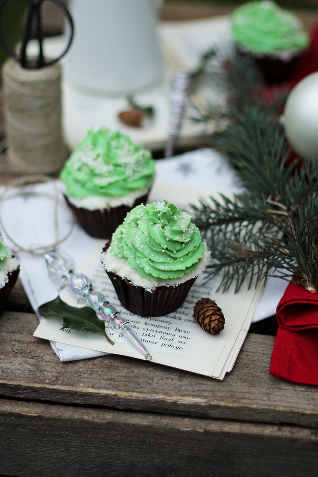 Świąteczne cupcakes są po protu urocze. Ostatnio pokazywałam Wam babeczki-czapeczki Mikołaja (klik), dziś przedstawiam wersję choinkową, ale to nie ostatni pomysł w tym roku. Baza to czekoladowo-pomarańczowe ciasto, do którego dla wzmocnienia smaku dodałam posiekanej, gorzkiej czekolady i