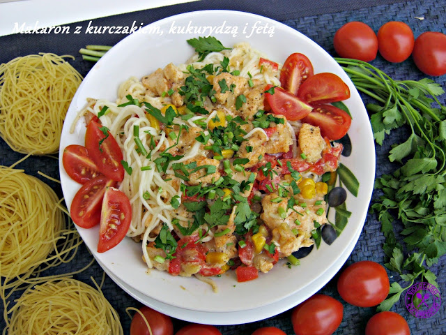 Świetny pomysł na wykorzystanie makaronu, którego ugotowało się nam za dużo. Do tego sos z kurczakiem, serem feta, czerwoną papryką i słodką kukurydzą. Szybki i smaczny obiad w kilka minut.