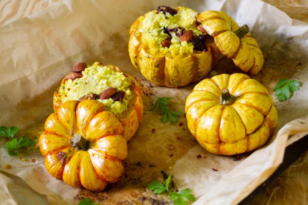Pieczona dynia faszerowana kaszą jaglaną z dodatkiem migdałów i żurawiny, to danie…