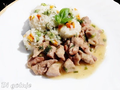 Gulasz z udźca indyka i ryż z marchewką i groszkiem