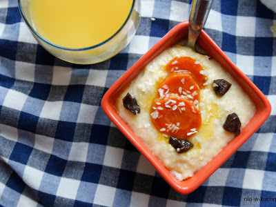 Ugotowana kasza jaglana, zmiksowana na kremowy mus z dodatkiem szczypty cynamonu i sokiem pomarańczowym. Tak oto powstał pyszny jaglany krem, do którego dodałam karmelizowaną marchewkę. Nieco pracochłonne, ale przepyszne. Zamiast karmelizowanej marchewki możecie dodać ulubione bakalie.