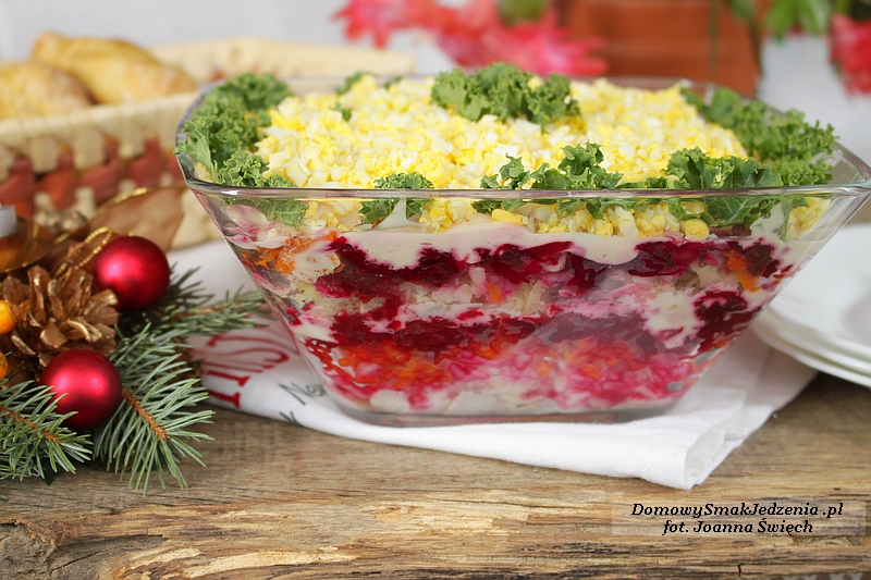 Śledzie odsączamy z nadmiaru oleju, kroimy je na mniejsze kawałeczki. Cebulę obieramy i kroimy w kosteczkę. Warzywa obieramy, ścieramy na tarce o