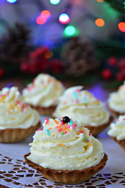 Kruche, cynamonowe spody z niewielką ilością cukru z prawdziwą wanilią, do tego krem waniliowy z bitej śmietany z rozpuszczoną białą czekoladą i słodka, kolorowa posypka z linii Decorada. Małe pychotki mniamniuśne! :)Spody do kruchych babeczek kiedyś Mama piekła w ilościach ogromnych 🙂 dostawaliśmy sporą partię do dekorowania, dzięki czemu zajęci