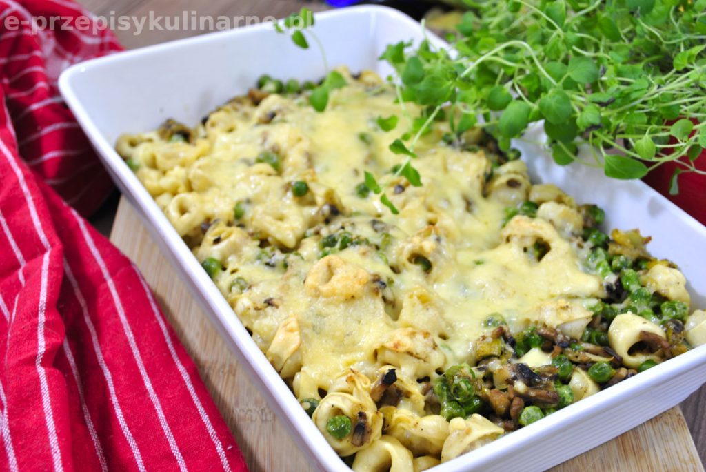 Przepis na smaczną, bezmięsną zapiekankę z makaronem tortellini, pieczarkami, porem i groszkiem.…