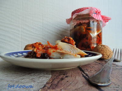 Śledzie z rodzynkami i orzechami włoskimi.