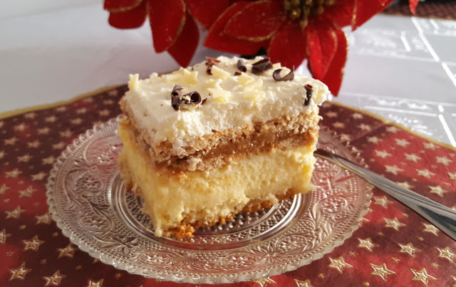 Biszkopt, krem budyniowy, słodki karmel i bita śmietana, a każda z warstw przełożona herbatnikami.