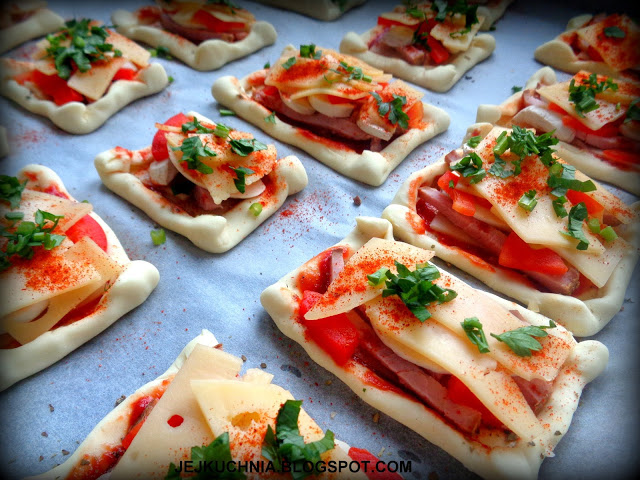 Składniki:opakowanie ciasta francuskiego,3 plastry szynki,6-8 plastrów