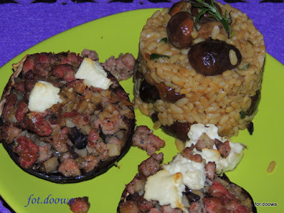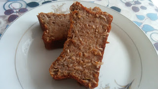4 banany1 szkl. płatków ryżowych2 jajka6 łyżek mąki1 łyżeczka proszku do pieczenia1 łyżeczka cukru waniliowego2 łyżki cukru trzcinowego1/2 szkl. wiórków kokosowych1 łyżeczka przyprawy do piernika1/2 szkl. oleju1/2 szkl. wrzącej wody Wykonanie: