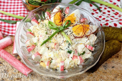 Sałatka jest prosta, szybka i jednocześnie niezwykle pyyyszna.Często gości na moim stole, tak samo jak jej pierwotna wersja, którą przedstawiłam tu – klik. Smak jajek i paluszków surimi – idealnie przełamuje ostrość szczypiorku, cebuli i dodatkowo ogórek.Musicie